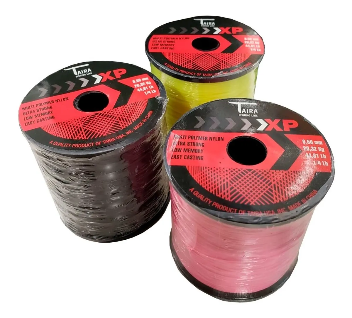 Nylon Taira XP 0.23mm, ideal para todo tipo de pesca se caracteriza, principalmente por la alta visibilidad de sus colores fluo, buen planchado y resistencia en kilos.