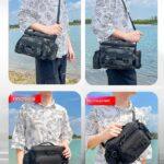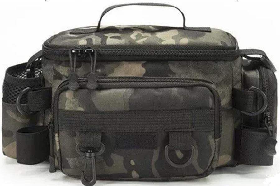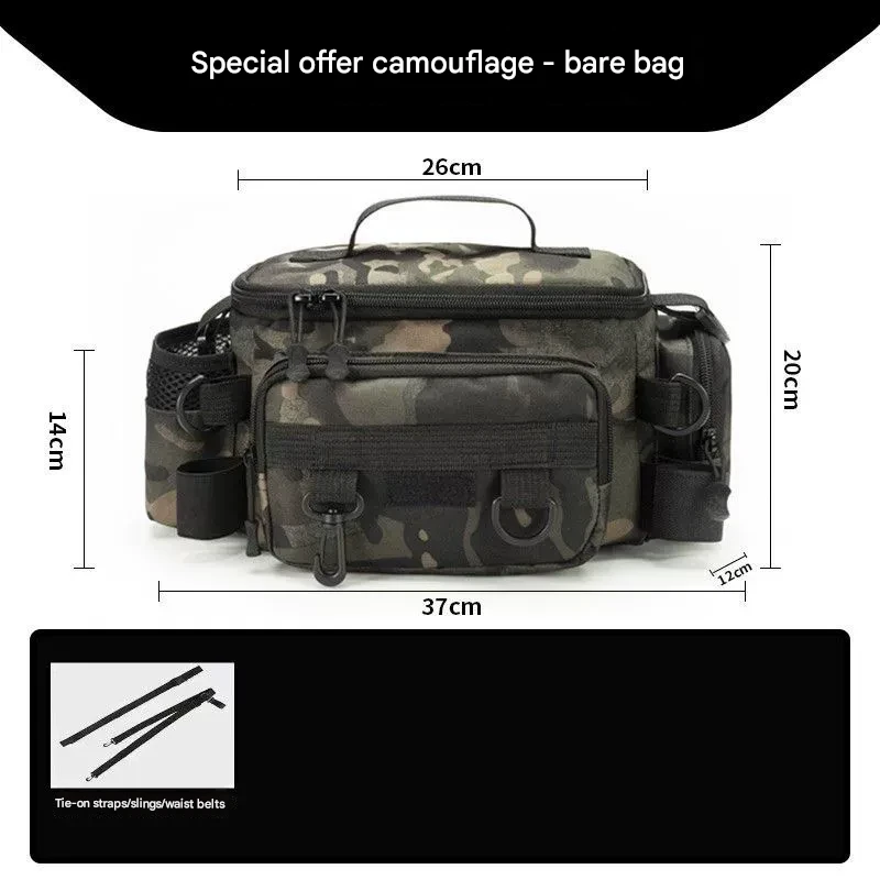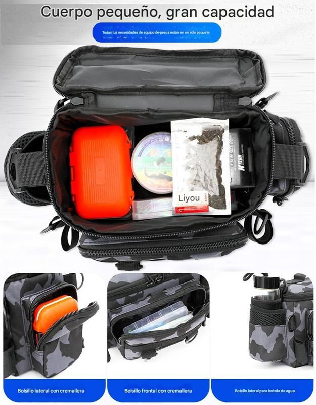 Bolso tipo riñonera/bandolera en tela Oxford 600D, indestructible y resistente al agua. Con sistema de correa ajustable para hombro y cintura, y doble sujeción para tu caña. Múltiples compartimentos en un diseño compacto