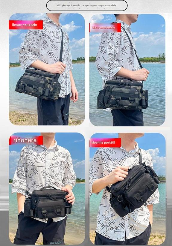 - Correas: Ajustables para hombro (bandolera) y para cintura (riñonera). Incluye sistema de doble agarre para caña en la correa.