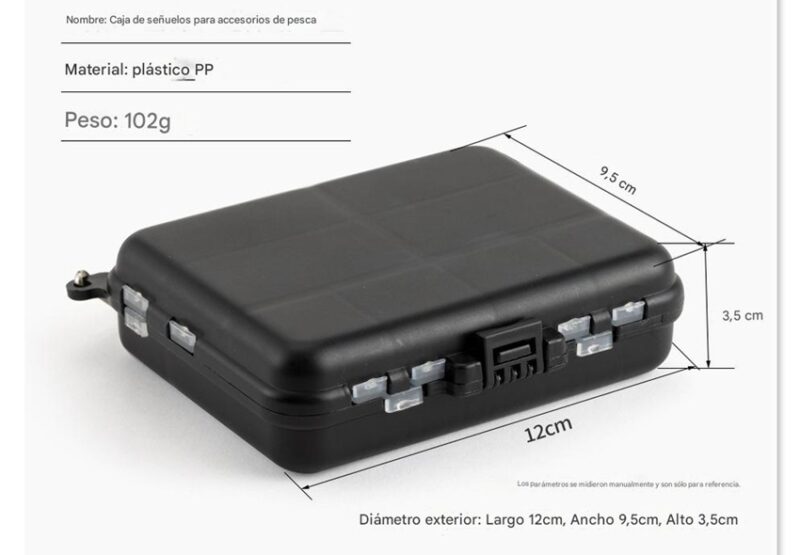 Fabricado en ABS de excelente calidad y gran grosor, este organizador es súper resistente a golpes, presión y al entorno de la pesca. Su diseño negro y profesional no ocupa espacio (medidas totales: 12 cm de largo x 3.5 cm de alto x 9.5 cm de ancho), pero ofrece una capacidad de organización enorme para todo lo pequeño e indispensable.