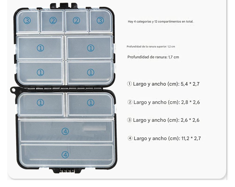 ✔️ Máxima Organización sin Mezclas: Las 12 tapas individuales son la clave. Podés dedicar cada compartimiento a un accesorio diferente (anzuelos del #8, esmerillones, mosquetones, etc.) y viajar con la seguridad de que todo llegará en perfecto orden.