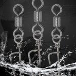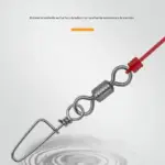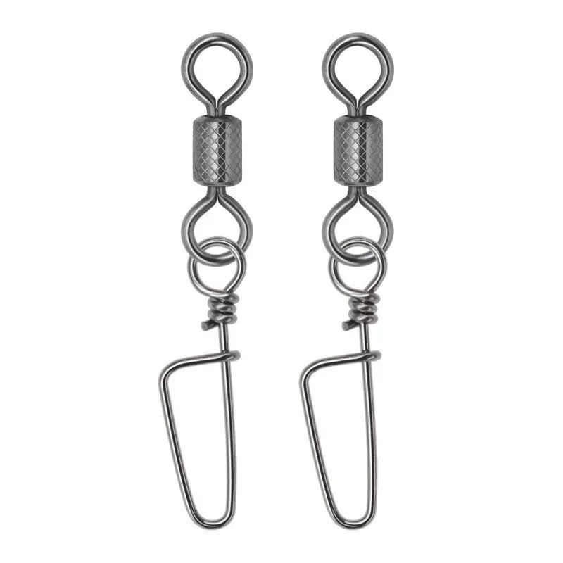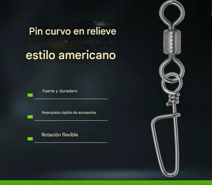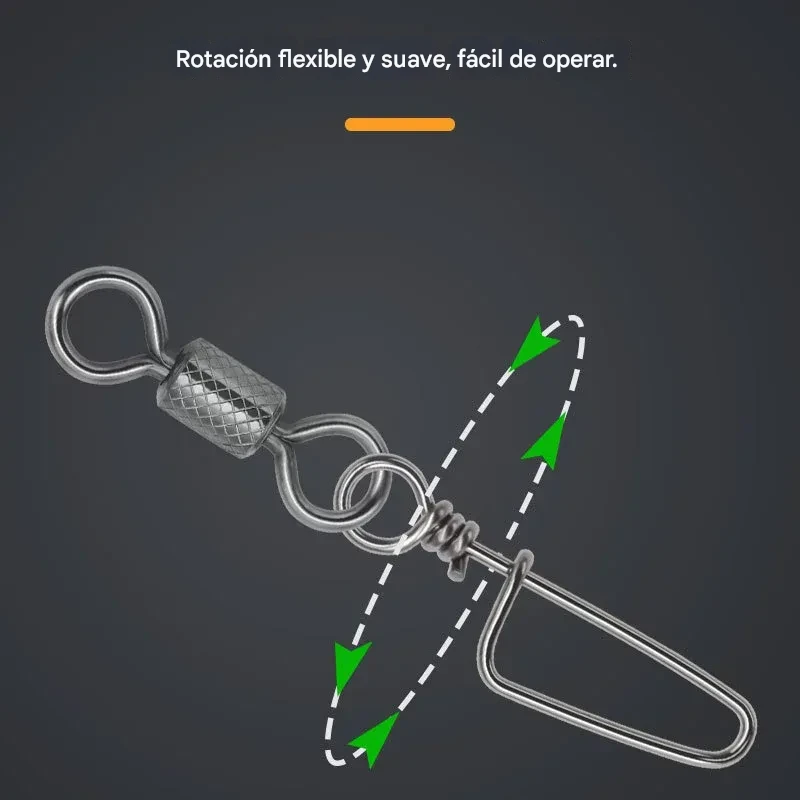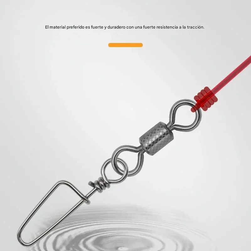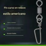 El detalle moleteado —una textura rugosa en la superficie del mosquetón— mejora el agarre y facilita una sujeción segura y rápida del anzuelo o señuelo.